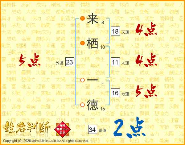 生活面を象徴する運勢です。外部から受ける影響力を表し、結婚運、家庭運や職場、環境への順応性を表します。総運から人運を引いた画数。姓や名が1文字の場合を除く。