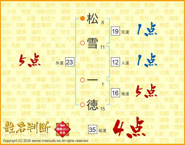 松(8画)雪(11画) 一(1画)徳(15画)