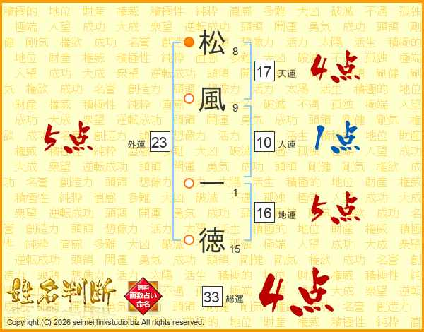 生活面を象徴する運勢です。外部から受ける影響力を表し、結婚運、家庭運や職場、環境への順応性を表します。総運から人運を引いた画数。姓や名が1文字の場合を除く。