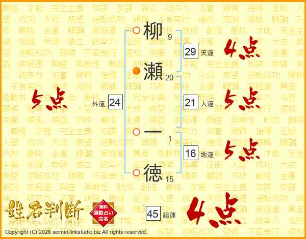 柳(9画)瀬(20画) 一(1画)徳(15画)