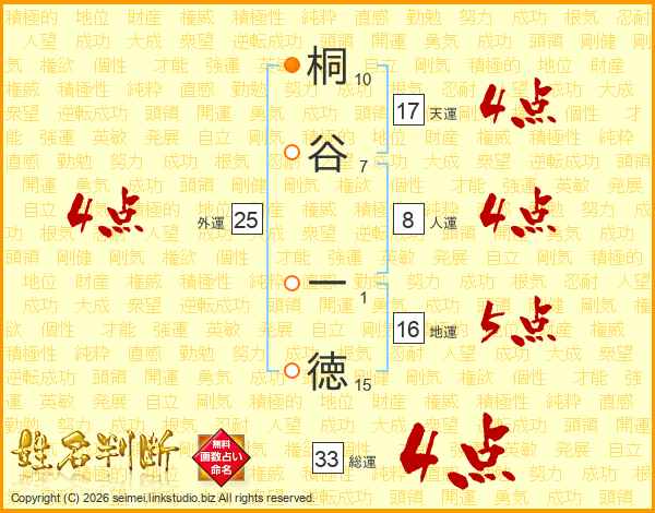 桐(10画)谷(7画) 一(1画)徳(15画)