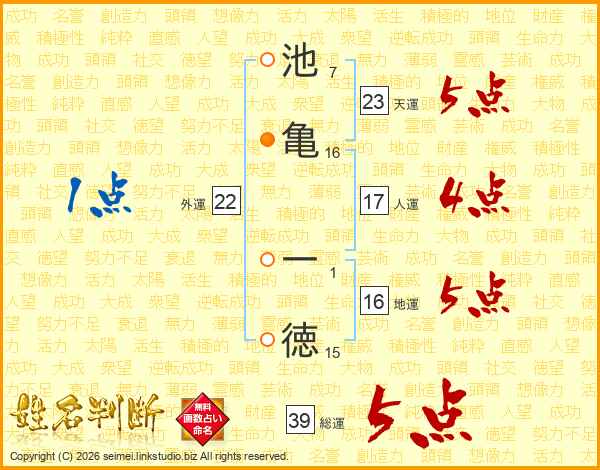 池亀一徳さんの総運は39画の5点!