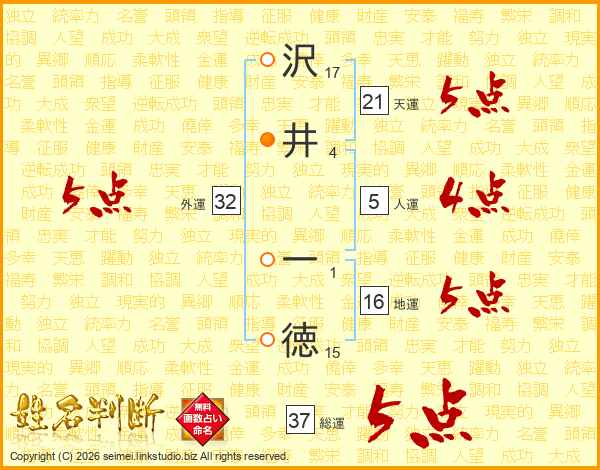 生活面を象徴する運勢です。外部から受ける影響力を表し、結婚運、家庭運や職場、環境への順応性を表します。総運から人運を引いた画数。姓や名が1文字の場合を除く。