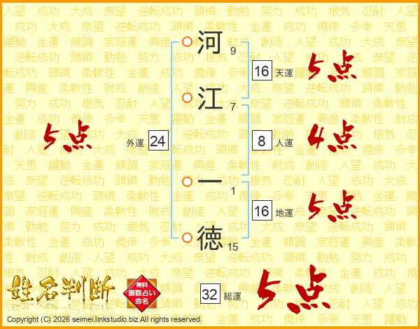 生活面を象徴する運勢です。外部から受ける影響力を表し、結婚運、家庭運や職場、環境への順応性を表します。総運から人運を引いた画数。姓や名が1文字の場合を除く。