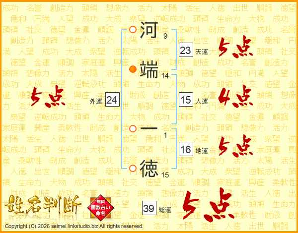 生活面を象徴する運勢です。外部から受ける影響力を表し、結婚運、家庭運や職場、環境への順応性を表します。総運から人運を引いた画数。姓や名が1文字の場合を除く。
