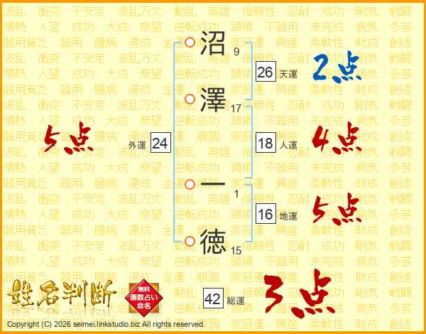 沼(9画)澤(17画) 一(1画)徳(15画)