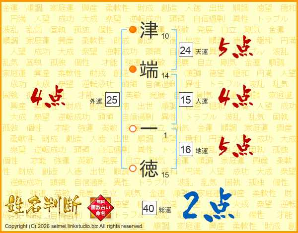 津(10画)端(14画) 一(1画)徳(15画)