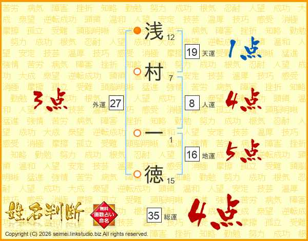 生活面を象徴する運勢です。外部から受ける影響力を表し、結婚運、家庭運や職場、環境への順応性を表します。総運から人運を引いた画数。姓や名が1文字の場合を除く。