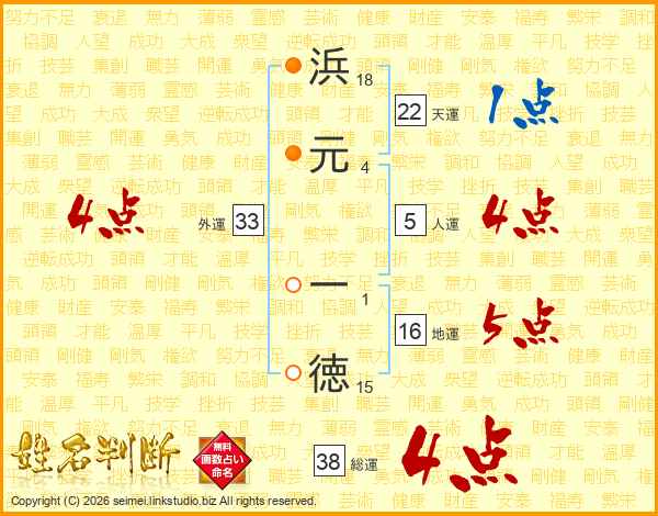 生活面を象徴する運勢です。外部から受ける影響力を表し、結婚運、家庭運や職場、環境への順応性を表します。総運から人運を引いた画数。姓や名が1文字の場合を除く。