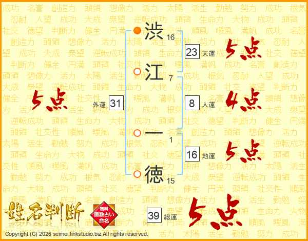 あなたの人生を表す1番重要な運勢です。生涯を通じて影響する総合運となり、主に50歳以降の晩年期に影響を及ぼします。苗字と名前の合計画数。