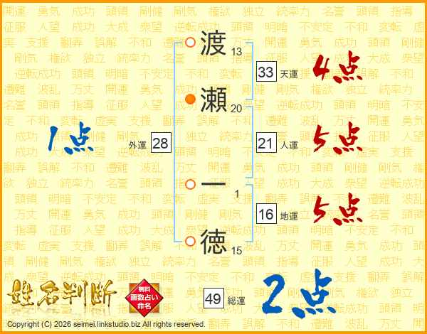 渡瀬一徳さんの総運は49画の2点!
