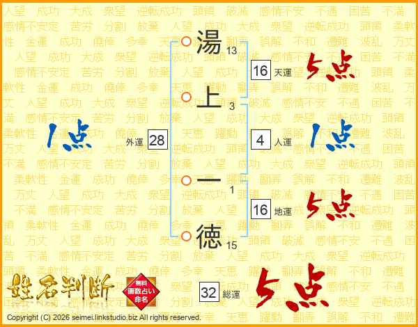生活面を象徴する運勢です。外部から受ける影響力を表し、結婚運、家庭運や職場、環境への順応性を表します。総運から人運を引いた画数。姓や名が1文字の場合を除く。