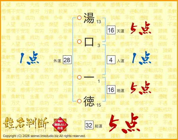 生活面を象徴する運勢です。外部から受ける影響力を表し、結婚運、家庭運や職場、環境への順応性を表します。総運から人運を引いた画数。姓や名が1文字の場合を除く。