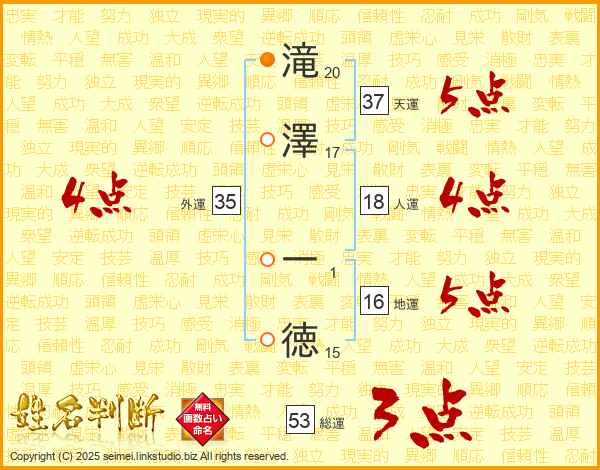 滝(20画)澤(17画) 一(1画)徳(15画)