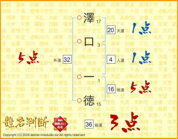 生活面を象徴する運勢です。外部から受ける影響力を表し、結婚運、家庭運や職場、環境への順応性を表します。総運から人運を引いた画数。姓や名が1文字の場合を除く。