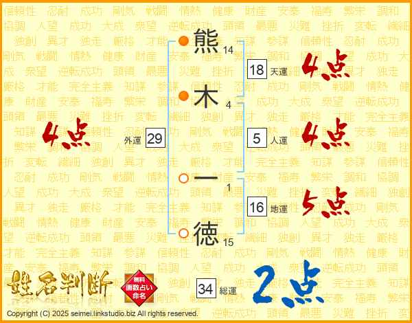 生活面を象徴する運勢です。外部から受ける影響力を表し、結婚運、家庭運や職場、環境への順応性を表します。総運から人運を引いた画数。姓や名が1文字の場合を除く。