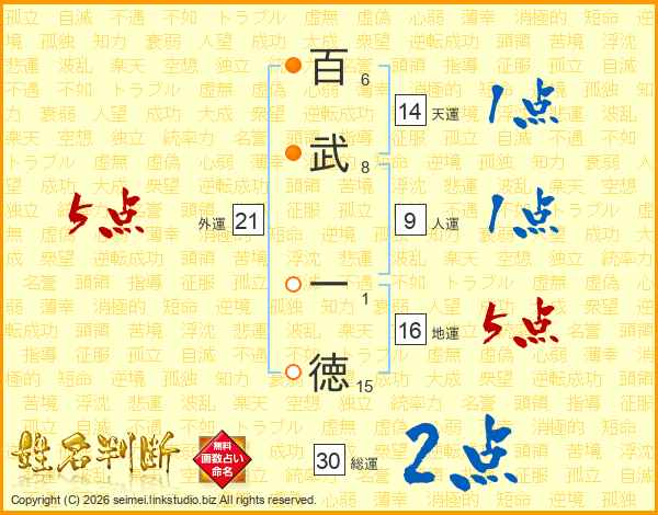 生活面を象徴する運勢です。外部から受ける影響力を表し、結婚運、家庭運や職場、環境への順応性を表します。総運から人運を引いた画数。姓や名が1文字の場合を除く。