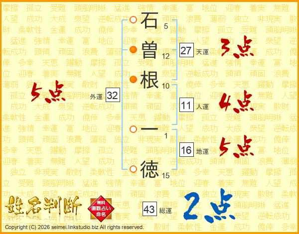 石(5画)曽(12画)根(10画) 一(1画)徳(15画)