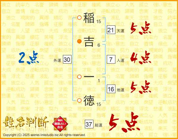 稲(15画)吉(6画) 一(1画)徳(15画)