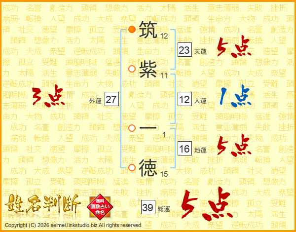 筑紫一徳さんの総運は39画の5点!