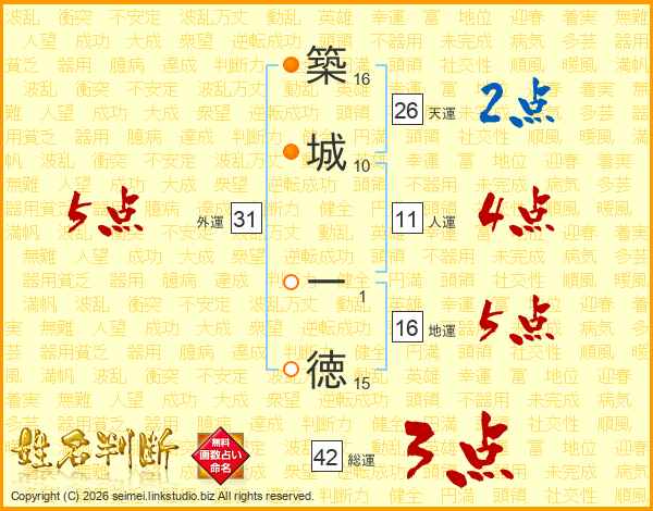 生活面を象徴する運勢です。外部から受ける影響力を表し、結婚運、家庭運や職場、環境への順応性を表します。総運から人運を引いた画数。姓や名が1文字の場合を除く。