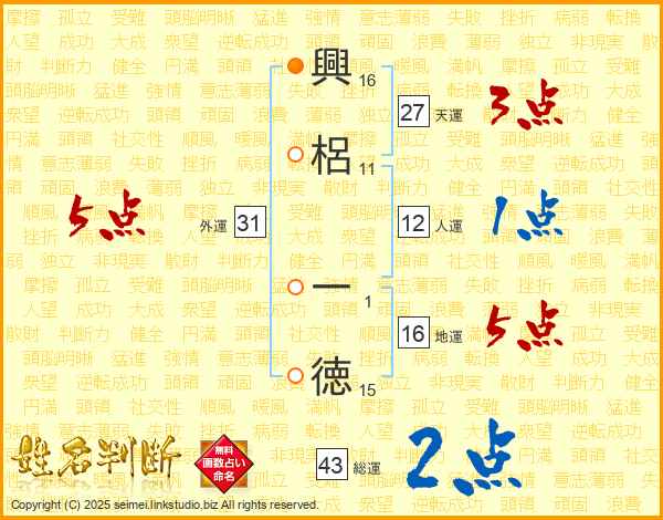 生活面を象徴する運勢です。外部から受ける影響力を表し、結婚運、家庭運や職場、環境への順応性を表します。総運から人運を引いた画数。姓や名が1文字の場合を除く。