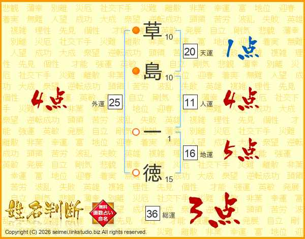 生活面を象徴する運勢です。外部から受ける影響力を表し、結婚運、家庭運や職場、環境への順応性を表します。総運から人運を引いた画数。姓や名が1文字の場合を除く。
