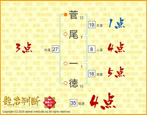 菅(12画)尾(7画) 一(1画)徳(15画)