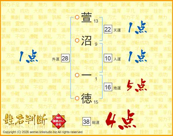 萱(13画)沼(9画) 一(1画)徳(15画)