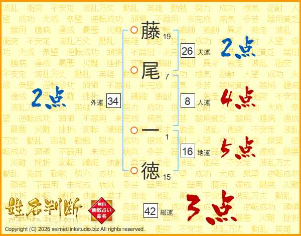 藤(19画)尾(7画) 一(1画)徳(15画)