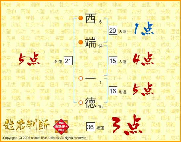 生活面を象徴する運勢です。外部から受ける影響力を表し、結婚運、家庭運や職場、環境への順応性を表します。総運から人運を引いた画数。姓や名が1文字の場合を除く。