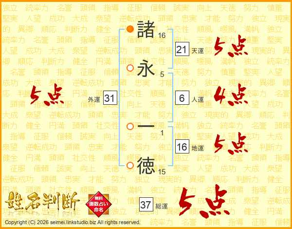諸永一徳さんの総運は37画の5点!