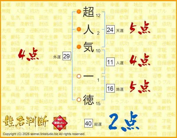 超(12画)人(2画)気(10画) 一(1画)徳(15画)