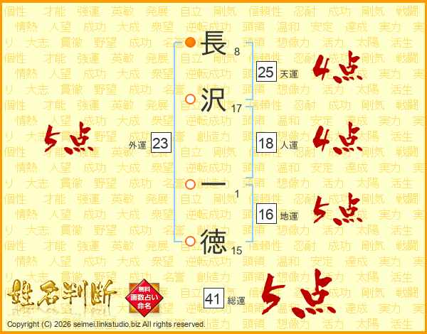 長(8画)沢(17画) 一(1画)徳(15画)