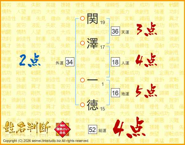 関澤一徳さんの総運は52画の4点!