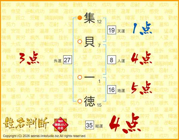 生活面を象徴する運勢です。外部から受ける影響力を表し、結婚運、家庭運や職場、環境への順応性を表します。総運から人運を引いた画数。姓や名が1文字の場合を除く。