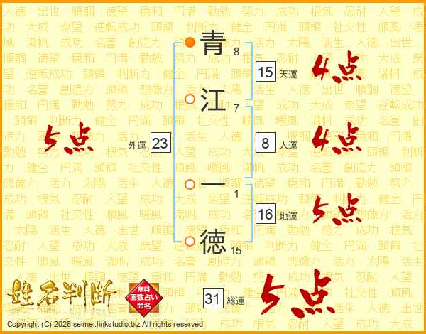 青江一徳さんの総運は31画の5点!