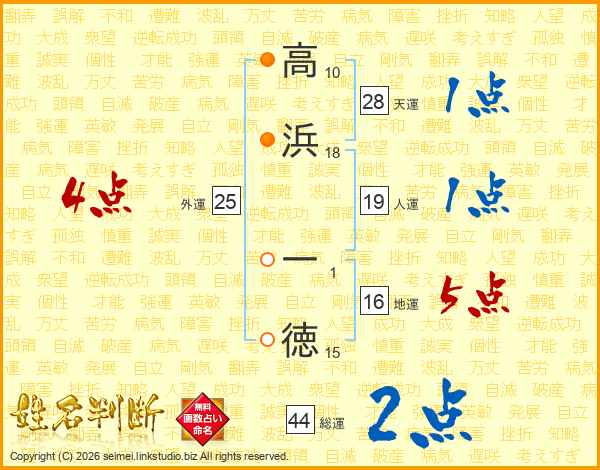 あなたの人生を表す1番重要な運勢です。生涯を通じて影響する総合運となり、主に50歳以降の晩年期に影響を及ぼします。苗字と名前の合計画数。