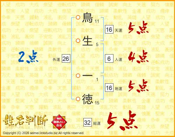 鳥生一徳さんの総運は32画の5点!