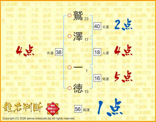 鷲(23画)澤(17画) 一(1画)徳(15画)