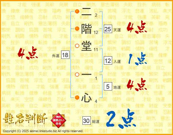 二(2画)階(12画)堂(11画) 一(1画)心(4画)