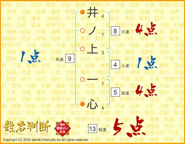 井ノ上一心さんの総運は13画の5点!