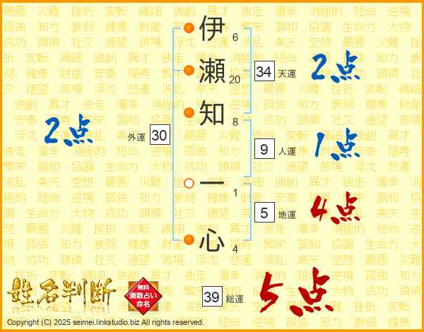 伊(6画)瀬(20画)知(8画) 一(1画)心(4画)