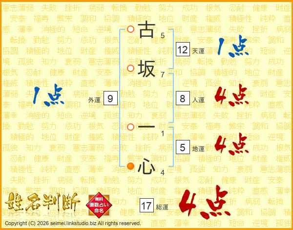 生活面を象徴する運勢です。外部から受ける影響力を表し、結婚運、家庭運や職場、環境への順応性を表します。総運から人運を引いた画数。姓や名が1文字の場合を除く。