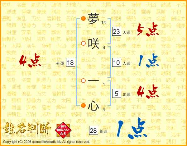 生活面を象徴する運勢です。外部から受ける影響力を表し、結婚運、家庭運や職場、環境への順応性を表します。総運から人運を引いた画数。姓や名が1文字の場合を除く。