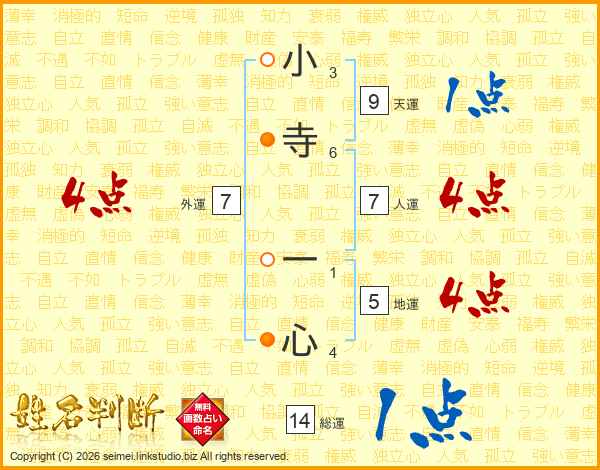 生活面を象徴する運勢です。外部から受ける影響力を表し、結婚運、家庭運や職場、環境への順応性を表します。総運から人運を引いた画数。姓や名が1文字の場合を除く。