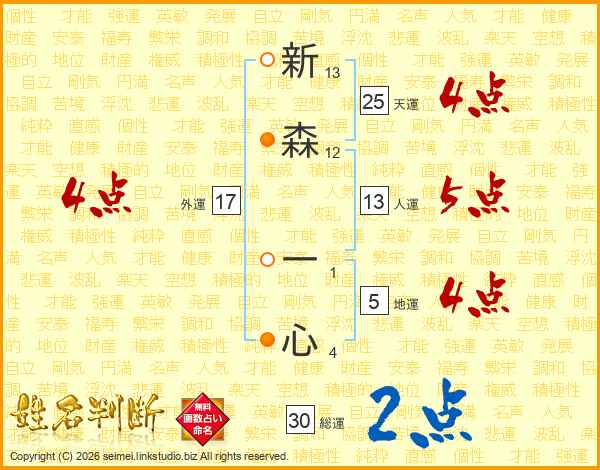 あなたの人生を表す1番重要な運勢です。生涯を通じて影響する総合運となり、主に50歳以降の晩年期に影響を及ぼします。苗字と名前の合計画数。