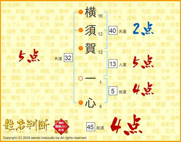 横(16画)須(12画)賀(12画) 一(1画)心(4画)