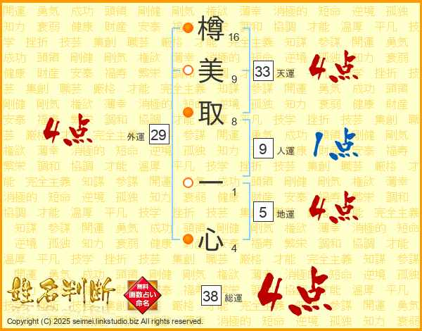 樽(16画)美(9画)取(8画) 一(1画)心(4画)