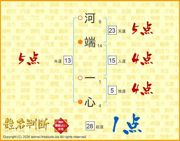 生活面を象徴する運勢です。外部から受ける影響力を表し、結婚運、家庭運や職場、環境への順応性を表します。総運から人運を引いた画数。姓や名が1文字の場合を除く。